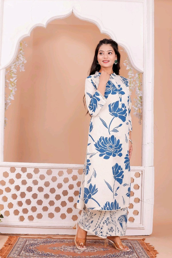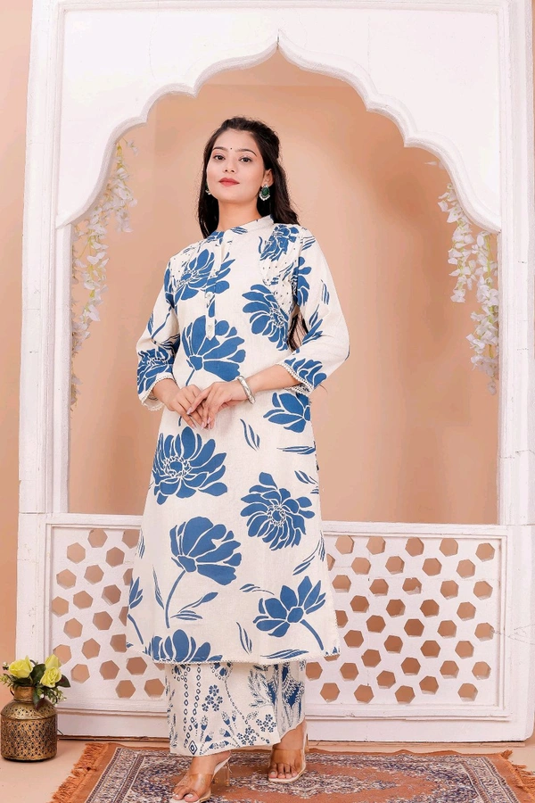 Step into sophistication with this Blue Blossom Long Kurti Set, featuring a stunning blue floral print on a soft, cream-colored fabric. The straight-cut kurti with three-quarter sleeves and a classic mandarin collar exudes effortless grace. Paired with printed palazzo pants, this ensemble is perfect for both casual and festive occasions. Lightweight and comfortable, it’s designed to keep you stylish all day long.